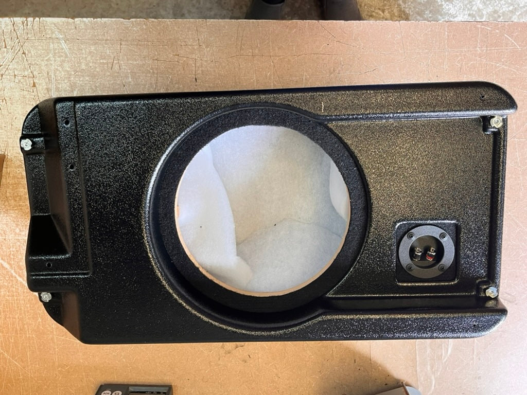 Single 10" Enclosure. Mounts to back Tailgate. Woofer is slot-loaded and fires against the tailgate, protecting it from the elements.